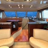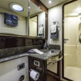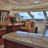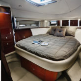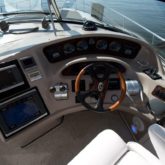 With comfort and luxury to boast about, the Sea Ray 58 Sedan Bridge is sleeker and more beautiful than any of its kind. There are three private staterooms and two full heads aboard the overall 58-foot 7-inch yacht, making her a perfect getaway vessel. A few standard features aboard the 58 Sedan Bridge are a Sea Ray navigator, vacuum system, Sub Zero refrigerator, and separate freezer, ice maker, transom show and a spacious flybridge with optimum seating. The access to the bridge is up a staircase on the starboard side. The bridge on the 58 Sedan provides excellent protection from any elements due to the hardtop. As for the helm, what a pleasure it is to work from. Among all the technical instruments, it even can take overhead photos of the area of the chart you are looking at so you can compare what you are seeing to what you should be seeing. The master suite is down below with a queen-sized berth, hanging lockers and other luxurious amenities.